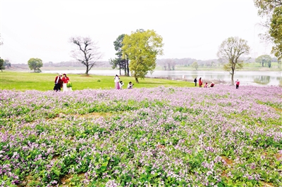 3月21日,南昌鱼目山公园内,大片二月兰沿湖岸肆意绽放,淡紫色花海铺展成春日盛景,吸引众多市民前来踏青游玩,在湖光与花香中享受惬意时光。