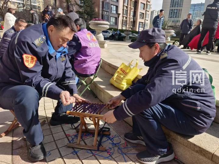 刘帅(左)和于爱忠(右)换马扎绳。(来源:信网)