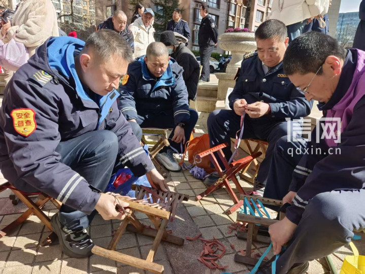 董福连、唐宝、张宝强、陈笑(从左至右)为居民换马扎绳。(来源:信网)